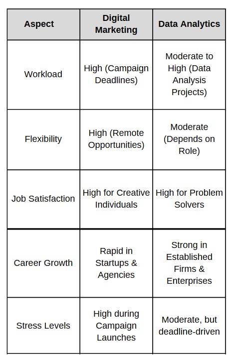 Digital marketing roles often involve dynamic, fast-paced work environments with tight deadlines. Data analytics, on the other hand, requires patience, deep problem-solving skills, and the ability to work with large datasets.